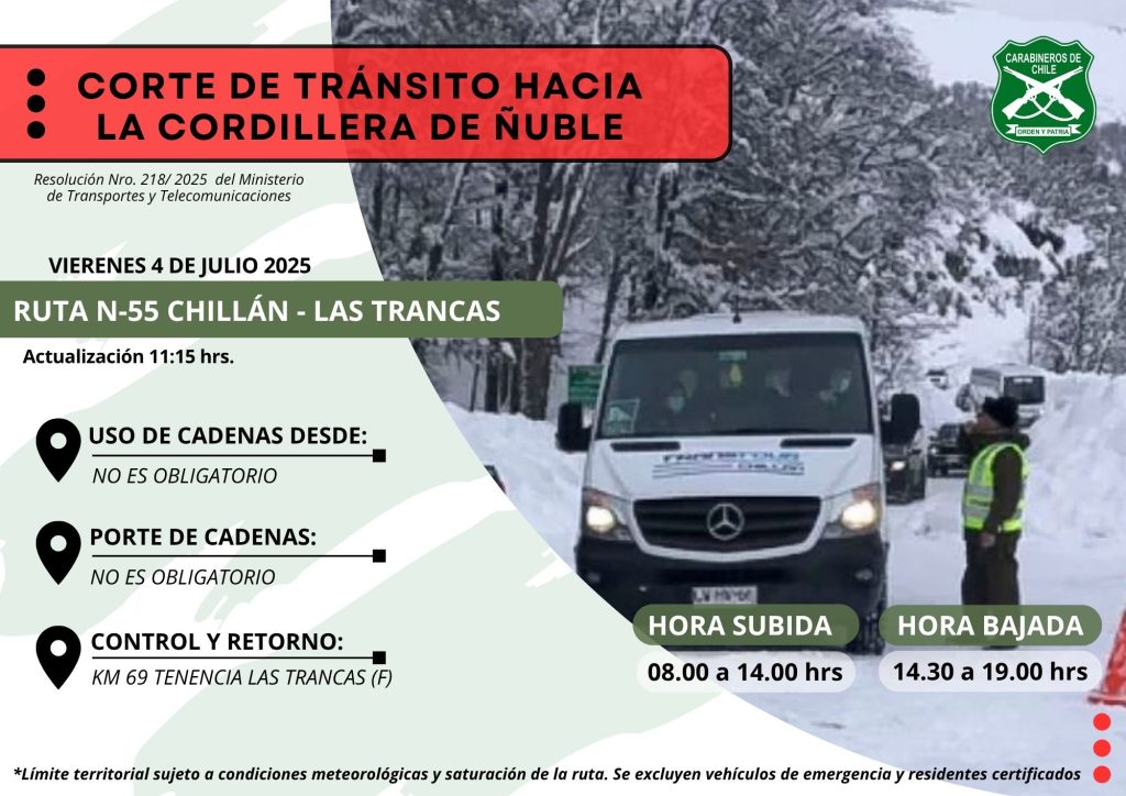 A contar de esta hora, se realiza corte del tránsito en la ruta N- 55, acceso a las termas de #Chillán, debido a la saturación del espacio por alto flujo vehicular. Carabineros de Tenencia #LasTrancas está controlando el retorno en el km 69, afuera del cuartel policial.