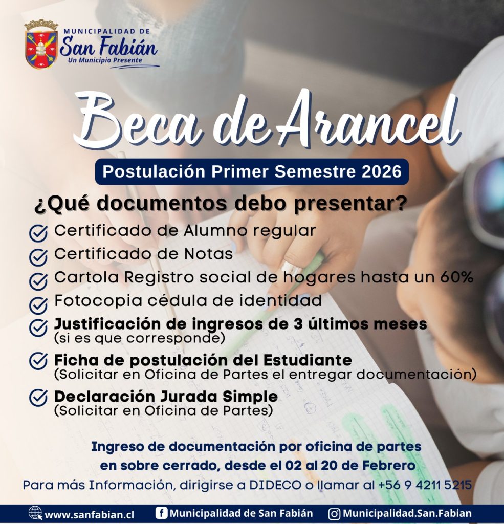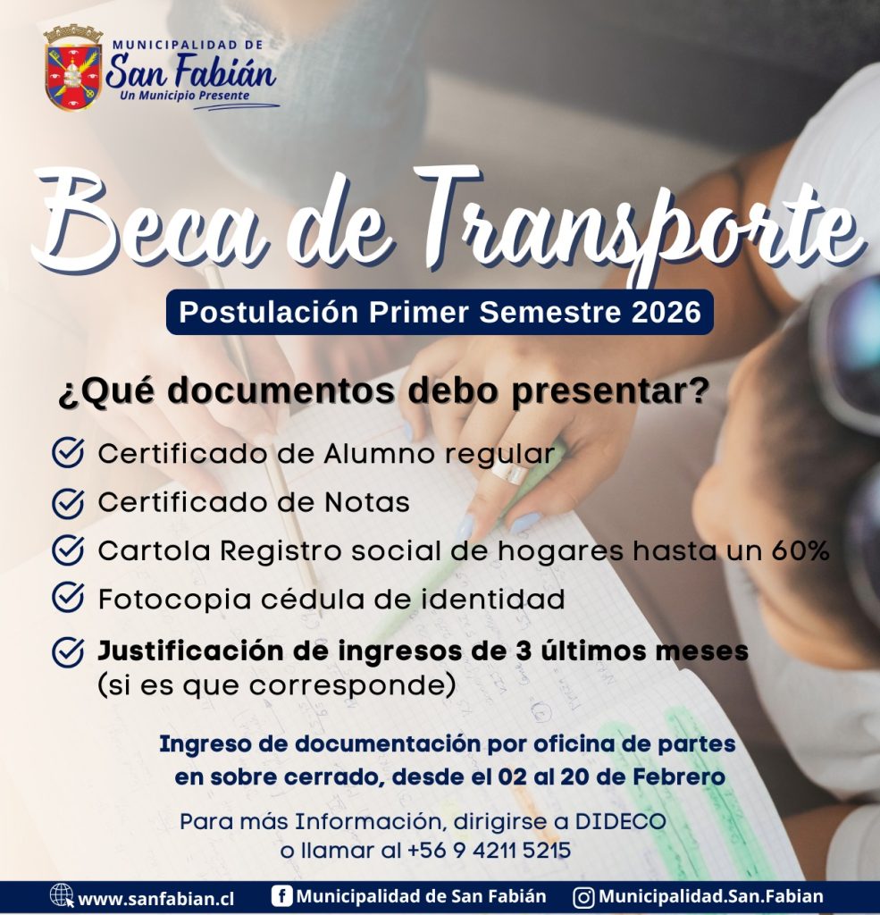 La Municipalidad de San Fabián informa que ya está disponible el proceso de postulación a la Beca de Arancel y Beca de Transporte para el primer semestre de 2026. Las y los estudiantes interesados deben entregar su documentación en sobre cerrado entre el 02 y el 20 de febrero en la Oficina de Partes e Informaciones.
