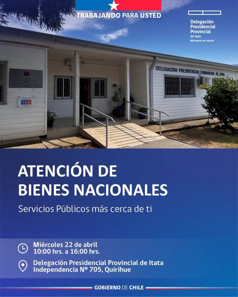 La Delegación Presidencial Provincial de Itata recibirá este miércoles 22 de abril al equipo de Bienes Nacionales, que atenderá a la comunidad entre las 10:00 y las 16:00 horas en Independencia N° 705, Quirihue.