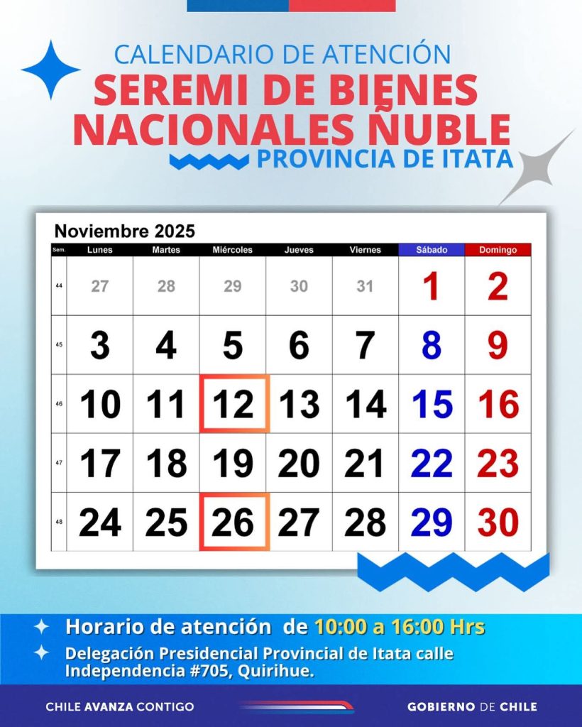 Este miércoles 26 de noviembre, la Secretaría Regional Ministerial de Bienes Nacionales de Ñuble realizará una jornada de atención ciudadana en la Provincia de Itata. La actividad se desarrollará entre las 10:00 y las 16:00 horas en la Delegación Presidencial Provincial, ubicada en calle Independencia N°705, comuna de Quirihue.