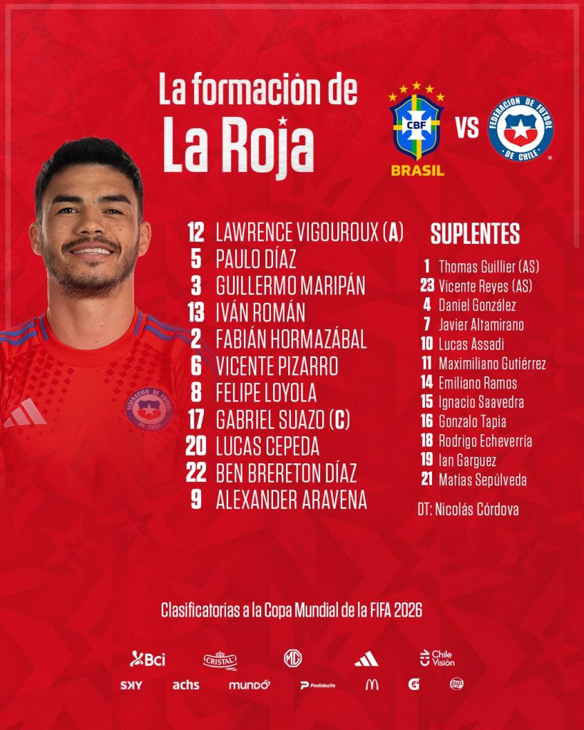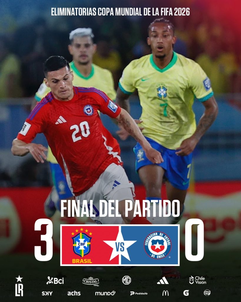 En un sólido encuentro disputado por la penultima fecha de las clasificatorias Mundial 2026, Brasil derrotó 3-0 a Chile con goles de Estêvão (38’), Bruno Guimarães (72’) y Lucas Paquetá (76’), este último tras asistencia de Luiz Henrique. El equipo brasileño dominó ambas mitades, mostrando contundencia ofensiva y control del juego. Chile no logró reaccionar ante el ritmo impuesto por la verdeamarela, que celebró con autoridad su victoria.