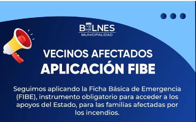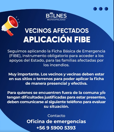 La Municipalidad de Bulnes informó que sigue aplicando la Ficha Básica de Emergencia (FIBE), requisito esencial para acceder a ayudas estatales, en beneficio de las familias damnificadas por los recientes incendios. Se solicita que los vecinos estén presentes en sus terrenos para facilitar el proceso. Quienes no puedan asistir por razones justificadas deben comunicarse con la Oficina de Emergencias al +56 9 5900 5393.