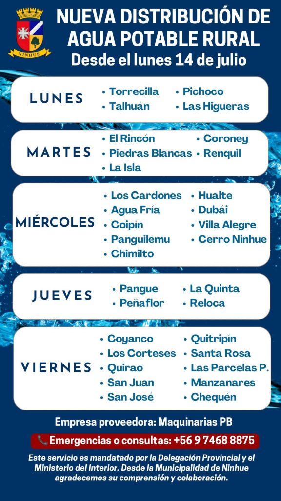 CALENDARIO DE DISTRIBUCIÓN DE AGUA POTABLE RURAL EN NINHUE.