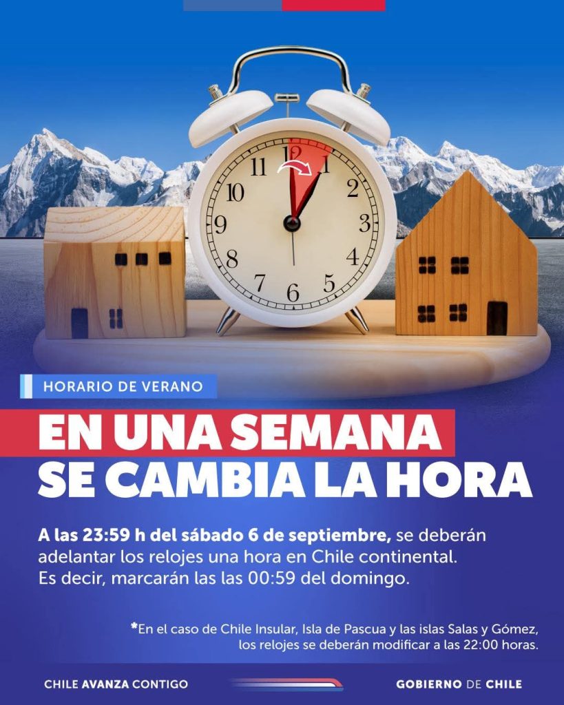 Este sábado 6 de septiembre, a las 23:59 horas, gran parte del país deberá adelantar los relojes una hora para dar inicio al horario de verano. Así, a la medianoche, los relojes marcarán directamente las 01:00 del domingo 7.