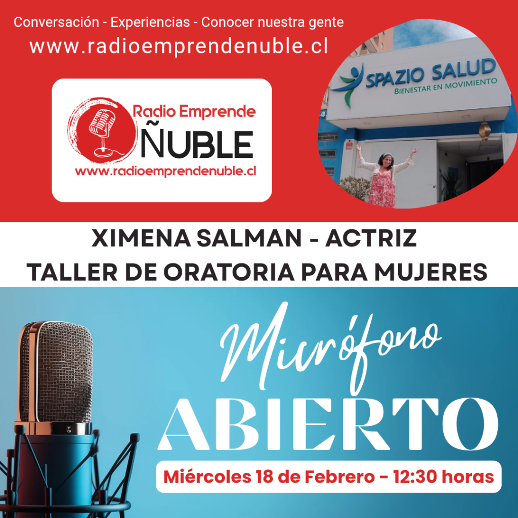 Descubre el poder de tu voz en Radio Emprende Ñuble. Este miércoles 18 de febrero a las 12:30 horas, acompáñanos en Micrófono Abierto y participa del Taller de Oratoria para Mujeres, guiado por la actriz Ximena Salman.Una experiencia para compartir, aprender y fortalecer la comunicación auténtica. 👉 Conéctate en www.radioemprendenuuble.cl y sé parte de esta
