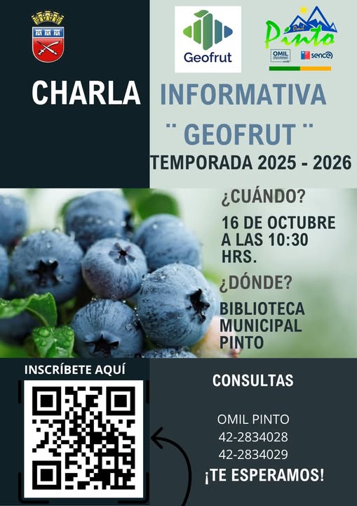La Ilustre Municipalidad de Pinto, a través de su Oficina OMIL y en colaboración con GeoFrut, invita a la comunidad a participar en una charla informativa sobre la temporada laboral 2025–2026. La actividad se realizará el miércoles 16 de octubre a las 10:30 horas en la Biblioteca Municipal de Pinto, y abordará oportunidades de empleo y procesos de contratación para la próxima temporada frutícola.