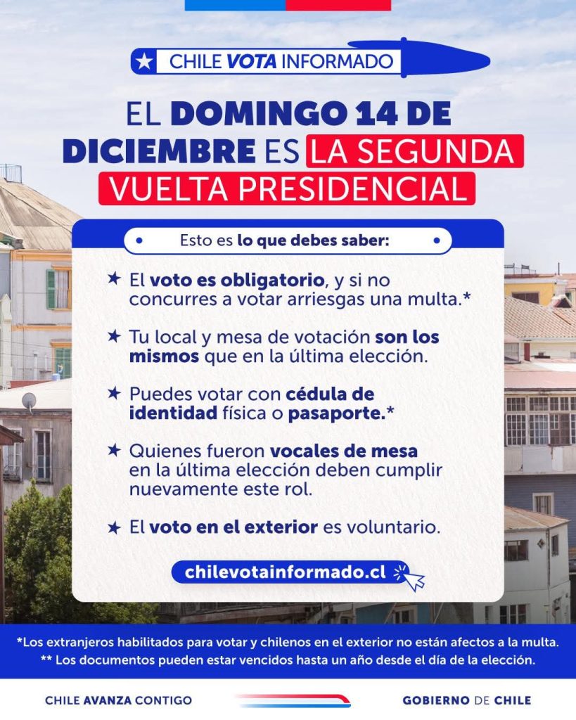 Este domingo 14 de diciembre se realizará la segunda vuelta presidencial en Chile. El voto es obligatorio para quienes residen en el país, y se mantiene el mismo local y mesa de votación que en la elección anterior. Se puede votar con cédula de identidad o pasaporte, incluso si están vencidos hasta por un año. Los vocales de mesa deberán repetir su función, mientras que el voto en el extranjero será voluntario.