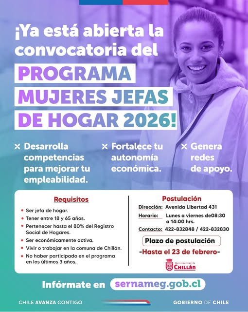 La Municipalidad de Chillán, en convenio con SERNAMEG, inició el proceso de postulación al Programa Mujeres Jefas de Hogar, que busca fortalecer la autonomía económica y ampliar las oportunidades laborales de las participantes. A través de talleres, capacitaciones y cursos en oficios y emprendimiento, el programa entrega herramientas concretas para el desarrollo personal y laboral.