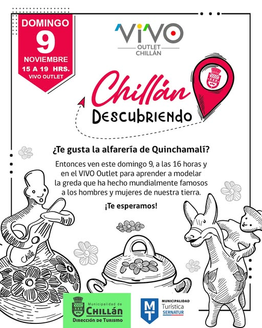 Este domingo 9 de noviembre, entre las 15:00 y 19:00 horas, el VIVO Outlet Chillán será escenario de “Chillán Descubriendo”, una actividad gratuita dedicada a la tradicional alfarería de Quinchamalí. A las 16:00 horas se realizará un taller abierto donde los asistentes podrán aprender a modelar la greda que ha dado fama internacional a los artesanos de la zona.