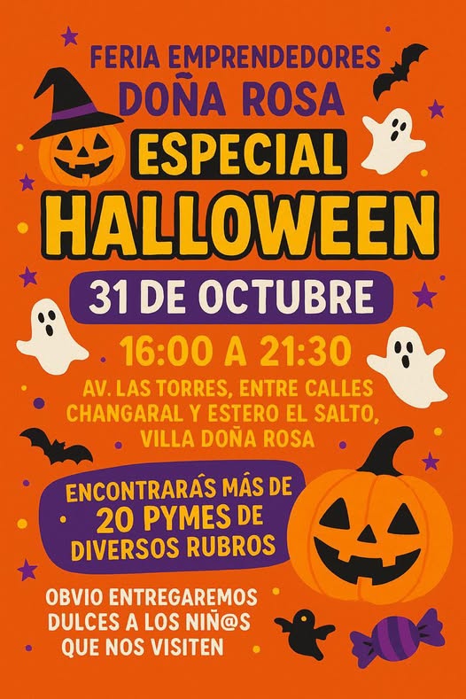 Este viernes 31 de octubre, de 16:00 a 21:30 hrs, se realizará la Feria de Emprendedores Doña Rosa – Especial Halloween en Av. Las Torres, entre Changaral y Estero El Salto. Más de 20 pymes ofrecerán productos únicos en gastronomía, dulces, plantas, belleza, moda circular, joyas y mucho más.