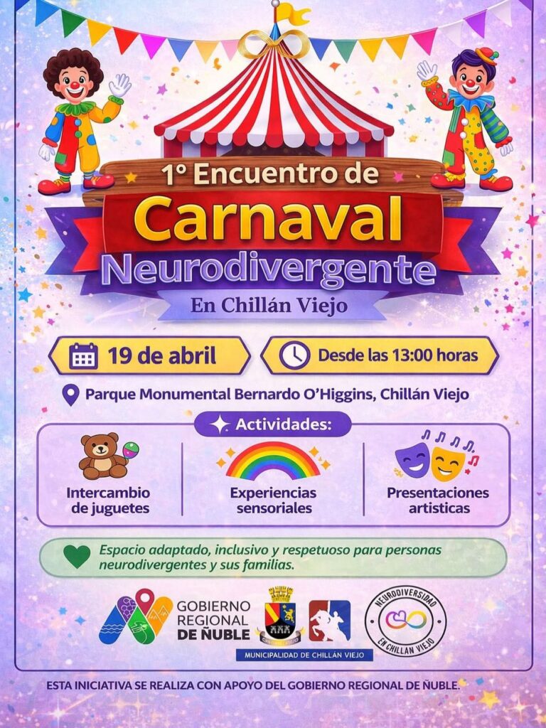 El próximo 19 de abril, Chillán Viejo será escenario del 1° Encuentro de Carnaval Neurodivergente, una jornada inclusiva que se desarrollará desde las 13:00 horas en el Parque Monumental Bernardo O’Higgins.