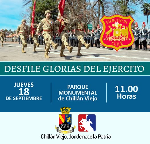 La Municipalidad de Chillán Viejo invita a toda la comunidad a participar del Desfile en honor a las Glorias del Ejército que se realizará este 18 de septiembre a las 11:00 horas en la explanada del Parque Monumental Bernardo O’Higgins