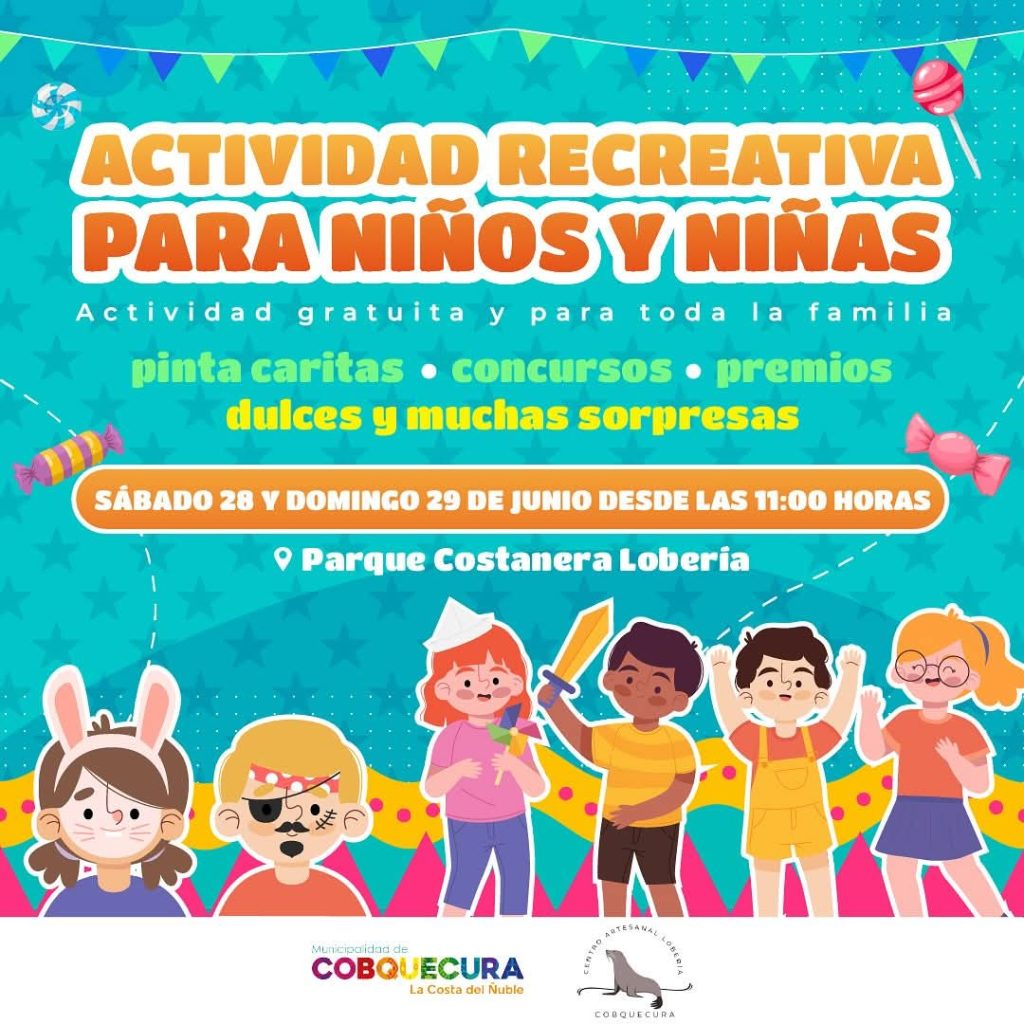 ¡Las vacaciones más entretenidas están en Cobquecura! Los invitamos a esta actividad recreativa para niñas y niños que se desarrollará este sábado 28 y domingo 29 de junio desde las 11:00 horas en Parque Costanera Lobería.