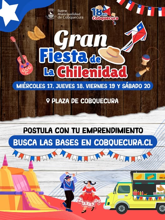 Ya comienza la semana oficial del 18, y por eso, el Municipio de Cobquecura invita a todos los emprendedores y emprendedoras a participar de la Fiesta de La Chilenidad en la plaza de la comuna. Para postular, pueden encontrar las bases en www.cobquecura.cl