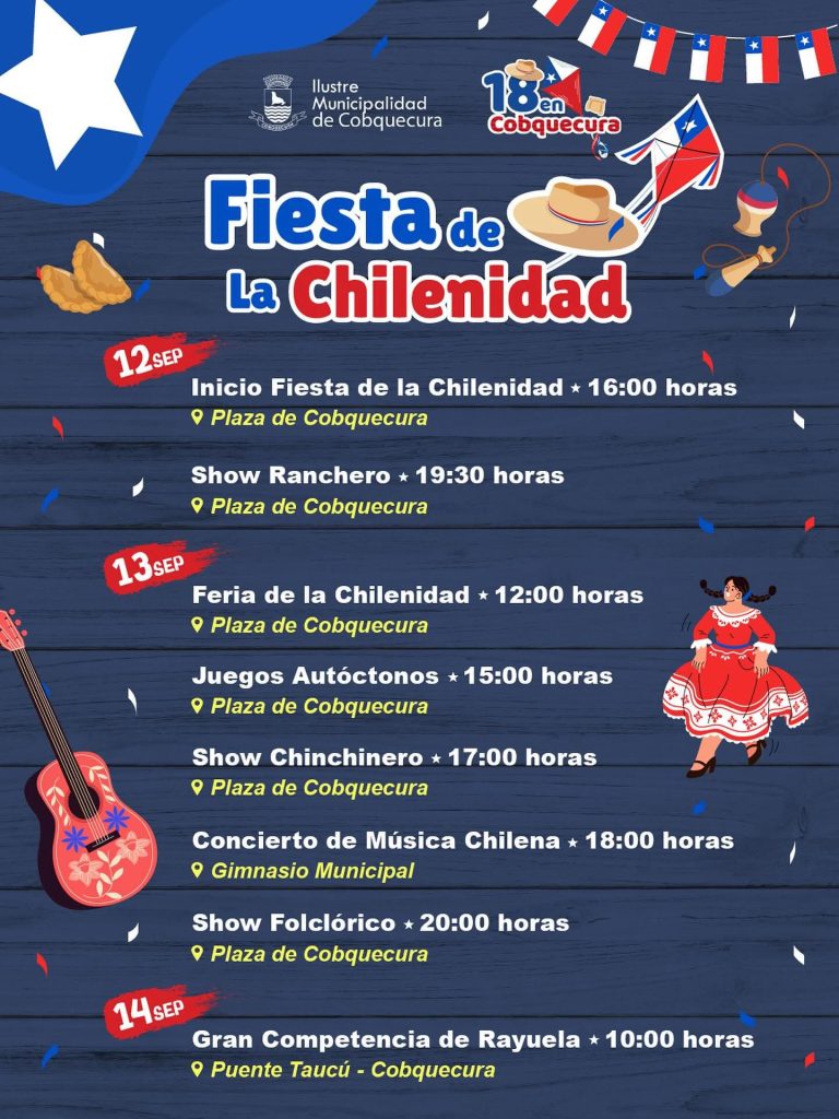 Cobquecura se viste de fiesta del 12 al 14 de septiembre con una programación que honra las raíces chilenas. La Ilustre Municipalidad organiza esta celebración con shows rancheros, feria típica, juegos autóctonos y conciertos de música nacional. El evento culmina con una gran competencia de rayuela en el Puente Taucú, destacando el espíritu comunitario y la identidad local.