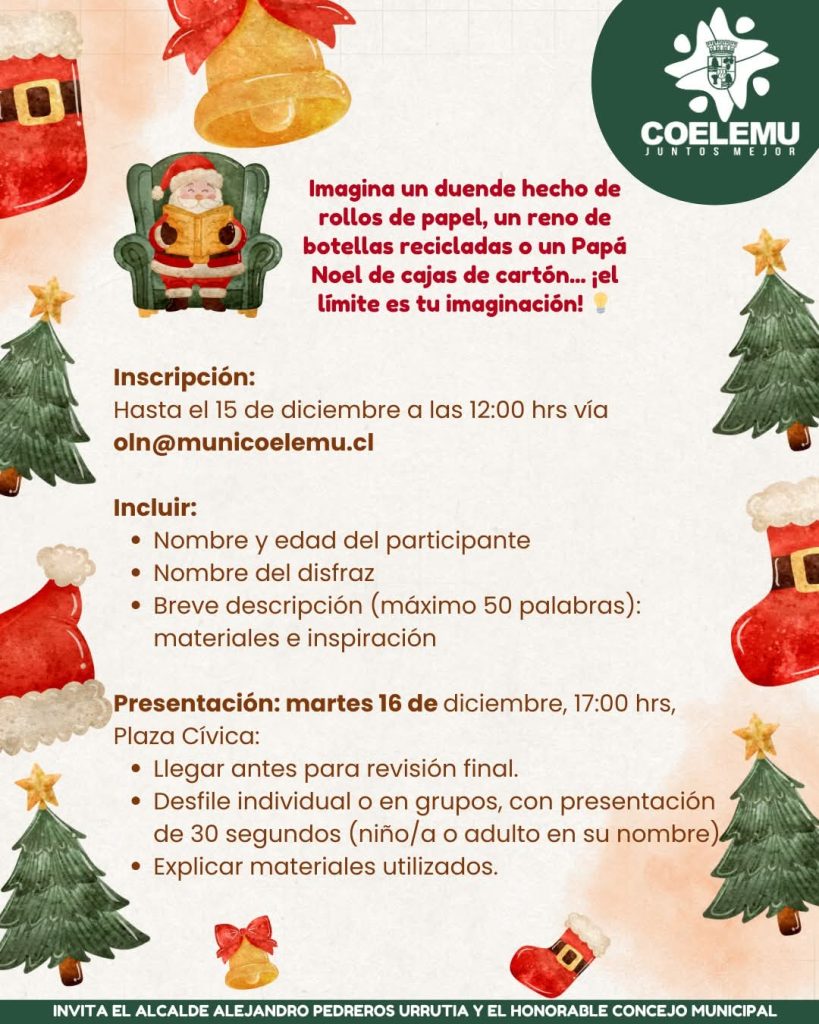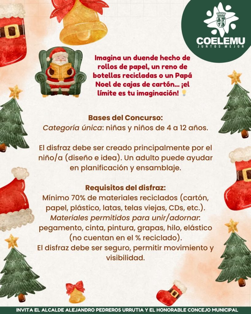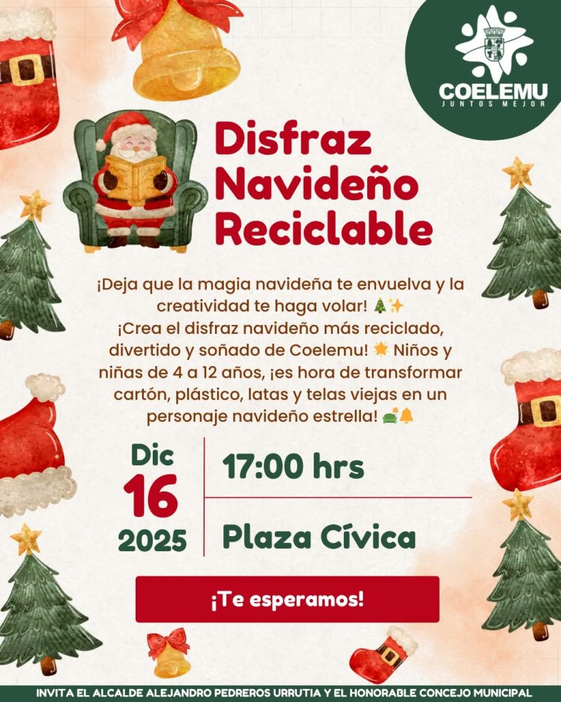 La Municipalidad de Coelemu invita a niños y niñas de 4 a 12 años a participar en el concurso “Disfraz Navideño Reciclable”, que se realizará el martes 16 de diciembre a las 17:00 hrs en la Plaza Cívica. La iniciativa busca fomentar la imaginación y el cuidado del medio ambiente mediante la creación de disfraces con al menos un 70% de materiales reciclados. El evento contará con desfile, presentación creativa y la magia de una Navidad sustentable.