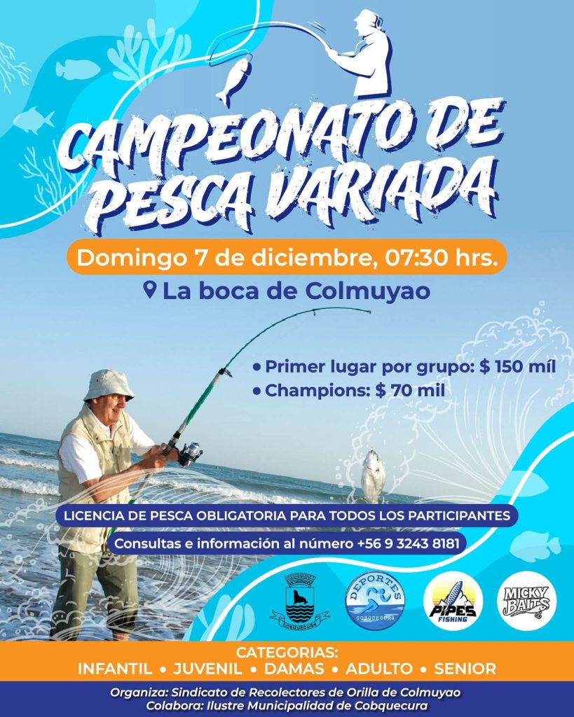 El próximo domingo 7 de diciembre a las 07:30 hrs, se realizará el esperado Campeonato de Pesca Variada en La boca de Colmuyao, organizado por el Sindicato de Recolectores de Orilla de Colmuyao con el apoyo de la Ilustre Municipalidad de Cobquecura.