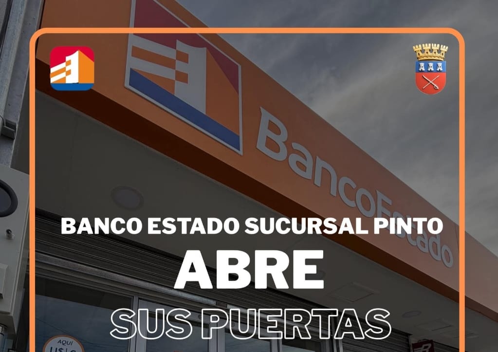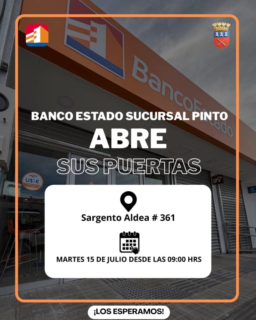 Este martes 15 de julio desde las 09:00 hrs, Banco Estado Sucursal Pinto abrirá oficialmente sus puertas para comenzar la atención de público, acercando sus servicios financieros a nuestra comunidad.