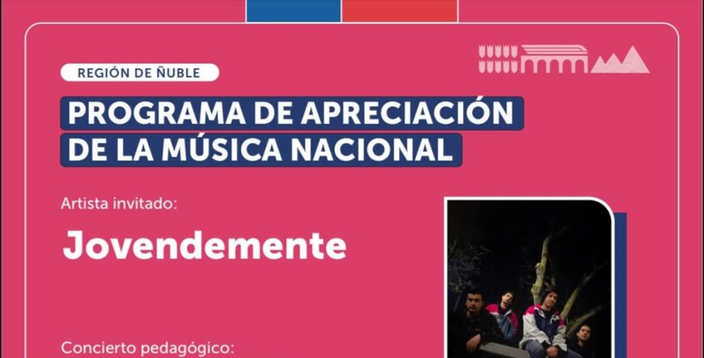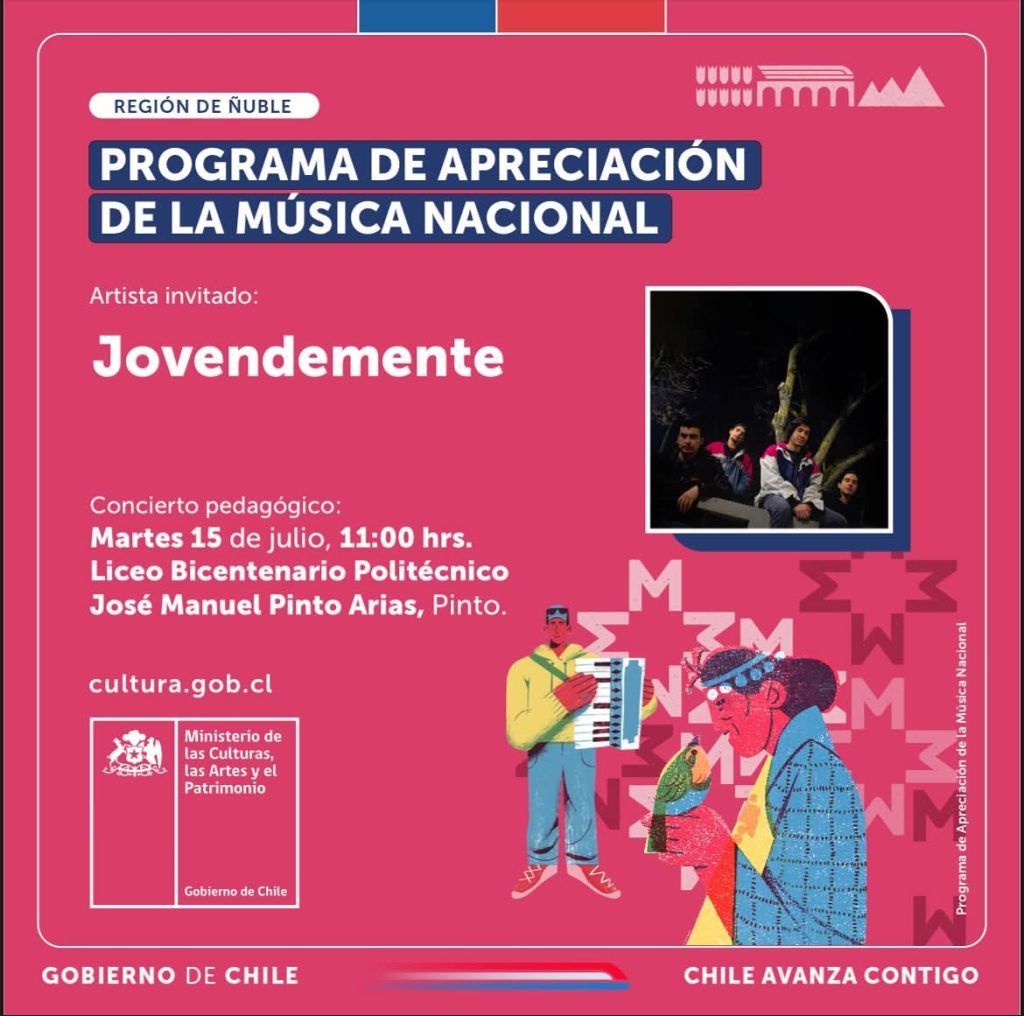 Pinto, Región de Ñuble – En el marco del Programa de Apreciación de la Música Nacional, el grupo Jovendemente grupo de San Carlos, se presentará con un concierto pedagógico el próximo martes 15 de julio a las 11:00 hrs. en el Liceo Bicentenario Politécnico José Manuel Pinto Arias, ubicado en la comuna de Pinto.