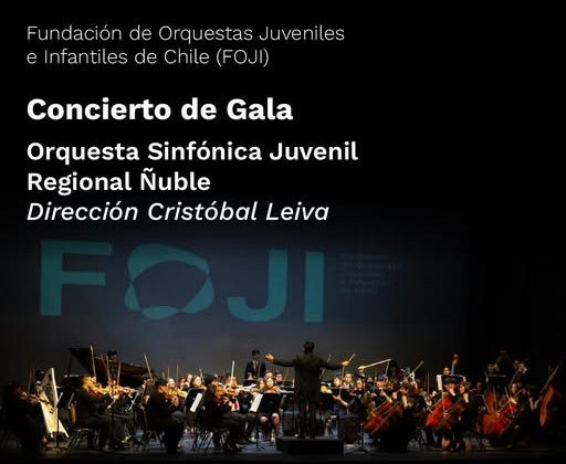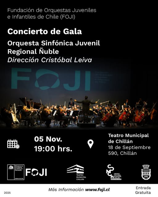 La Fundación de Orquestas Juveniles e Infantiles de Chile (FOJI) invita al Concierto de Gala de la Orquesta Sinfónica Juvenil Regional Ñuble, dirigida por el maestro Cristóbal Leiva. El evento se realizará este martes 5 de noviembre a las 19:00 horas en el Teatro Municipal de Chillán. La entrada es gratuita y el acceso será por orden de llegada. Una oportunidad única para disfrutar del talento musical de la juventud ñublensina.
