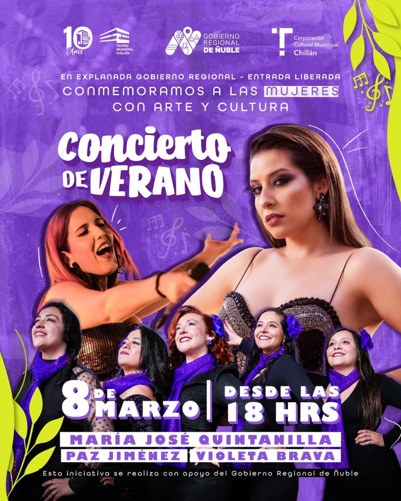 En el marco del Día Internacional de la Mujer, la Corporación Cultural Municipal de Chillán invita al Concierto de Verano, que se realizará el 8 de marzo desde las 18:00 horas en la explanada del Gobierno Regional de Ñuble. El evento contará con la presentación de María José Quintanilla, junto a las artistas locales Violeta Brava y Paz Jiménez, además de la animación y humor de Renata Bravo.