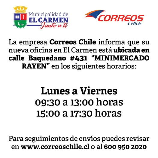 La Municipalidad de El Carmen, en conjunto con Correos Chile, anunció la apertura de una nueva oficina de atención ubicada en calle Baquedano #431, al interior del Minimercado Rayen.