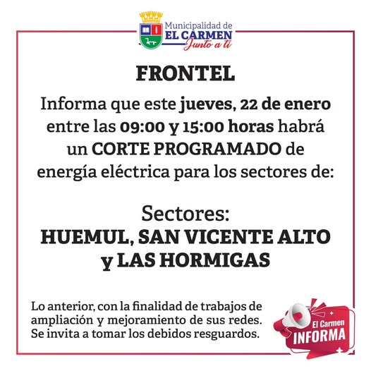 La Municipalidad de El Carmen informa que este jueves 22 de enero, entre las 09:00 y 15:00 horas, se realizará un corte programado de energía eléctrica en los sectores Huemul, San Vicente Alto y Las Hormigas.