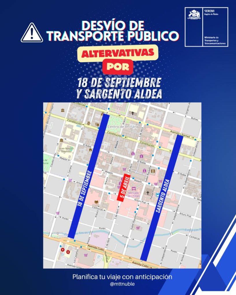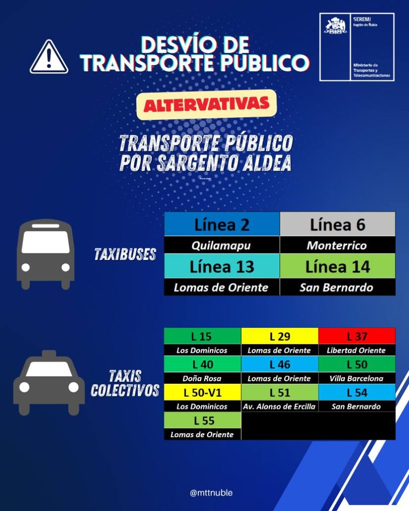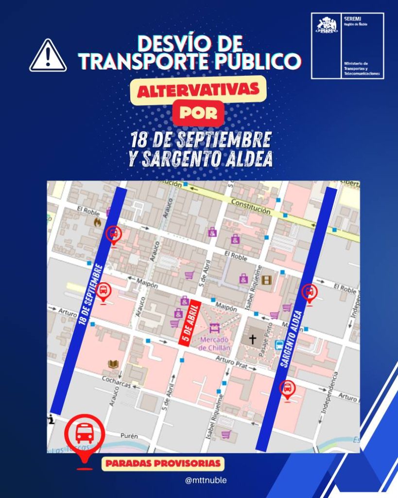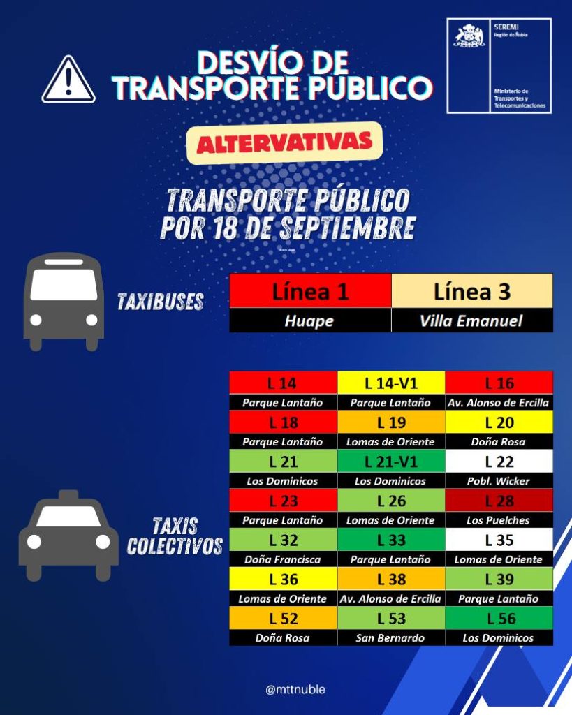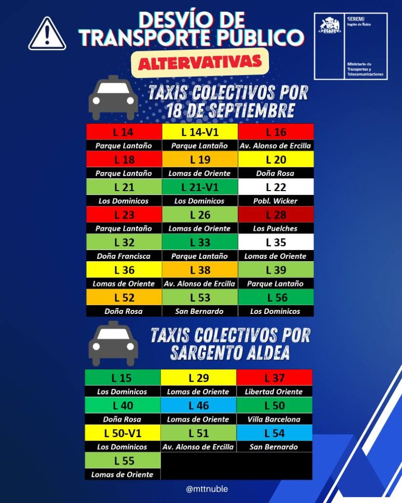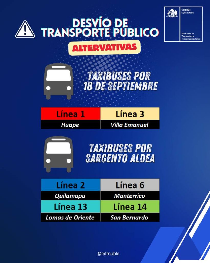 - Desvíos de taxibuses y taxis colectivos, informados por las líneas respectivas.