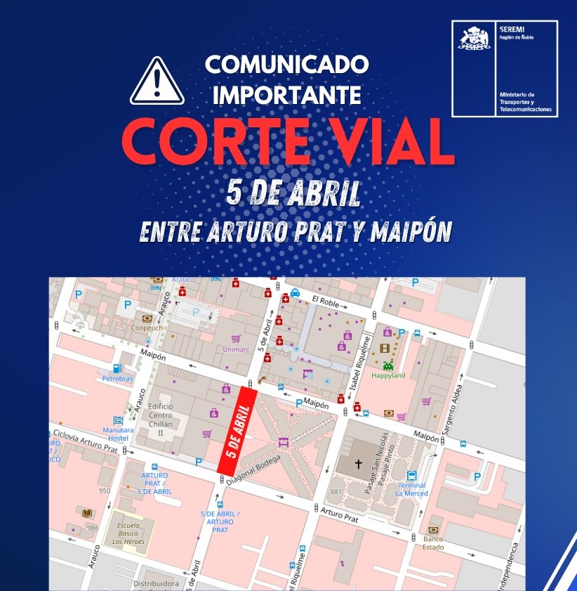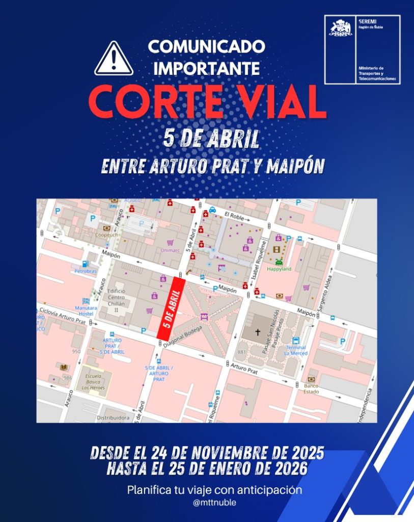 Desde el 24 de noviembre de 2025 hasta el 25 de enero de 2026, permanecerá cerrado el tramo de Calle 5 de abril entre Arturo Prat y Maipón. La medida contempla: