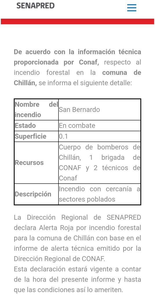 La Dirección Regional de SENAPRED declaró Alerta Roja para la comuna de Chillán debido al incendio forestal “San Bernardo”, que se encuentra en combate y ha afectado 0,1 hectáreas.