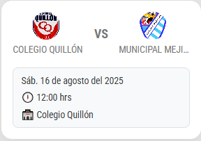 Este sábado 16 de agosto a las 12:00 horas, Deportes Quillón será anfitrión de Municipal Mejillones en un duelo clave por la Fecha 19 del Campeonato de Tercera División. El encuentro se disputará en el recinto de Colegio Quillón, donde ambos equipos buscarán sumar puntos decisivos por la parte baja de la tabla de posiciones en la recta final del torneo.