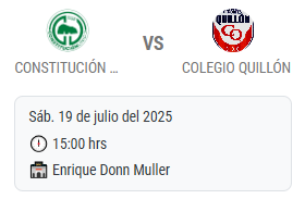 Este sábado 19 de julio de 2025, Colegio Quillón tendrá una dura salida al enfrentar a Constitución Unido en el estadio Enrique Donn Muller, a partir de las 15:00 horas, en un partido correspondiente a la Fecha 15 del Campeonato de Tercera División A.