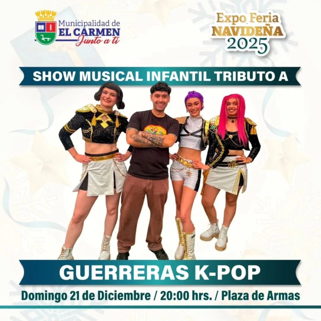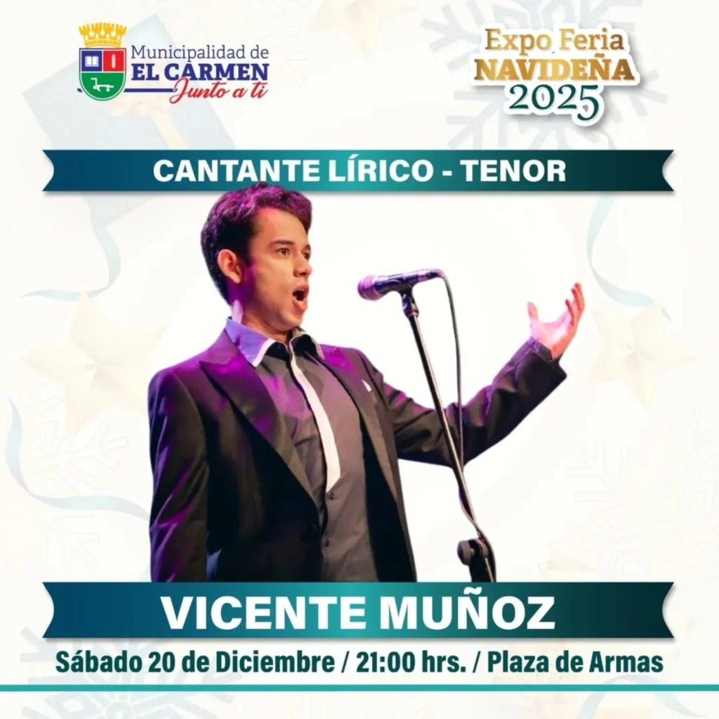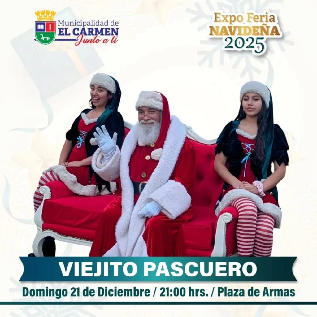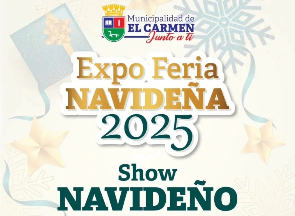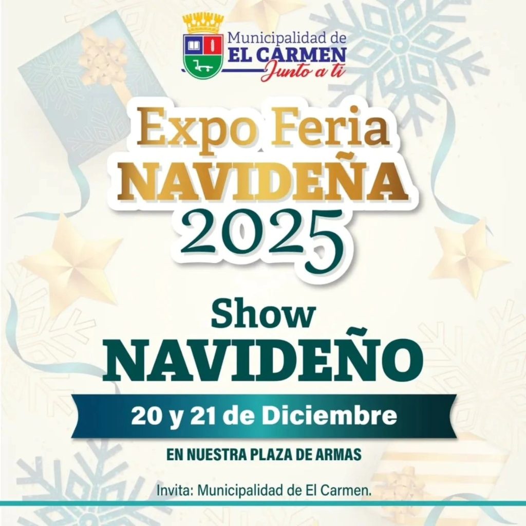 La Municipalidad de El Carmen invita a toda la comunidad a disfrutar de la Expo Feria Navideña 2025, una celebración llena de encanto que se realizará los días sábado 20 y domingo 21 de diciembre en la Plaza de Armas.