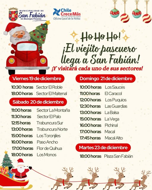 La Municipalidad de San Fabián, junto a la Oficina Local de la Niñez de Chile Crece Más, invita a todas las familias a disfrutar de la mágica visita del Viejito Pascuero, quien recorrerá diversos sectores de la comuna entre el 19 y el 23 de diciembre. Niñas y niños podrán saludarlo, tomarse fotos y recibir sorpresas en una gira llena de espíritu navideño que culminará en la Plaza de San Fabián. ¡Una celebración pensada para compartir alegría y unión en cada rincón del territorio!