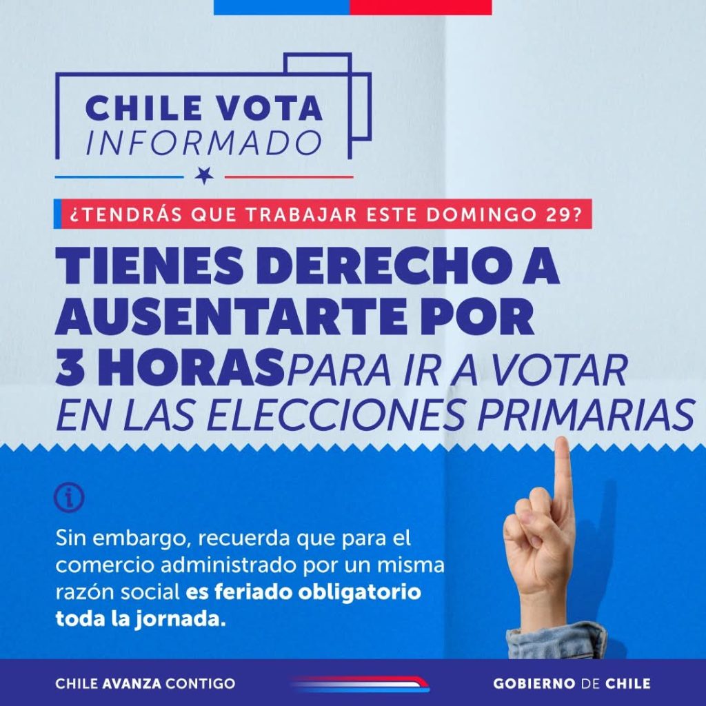 🗳️ Este domingo 29 de junio #ChileVotaInformado en las Elecciones Primarias Presidenciales. Recuerda que, si trabajas ese día, la ley te permite ausentarte hasta por 3 horas para ir a votar y que el voto es voluntario.