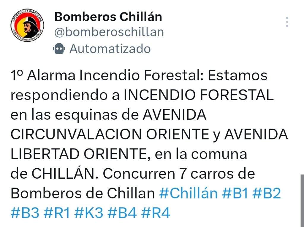 Bomberos de Chillán a través de su cuenta X, informa de incendio forestal en la intersección de Avenida Circunvalación Oriente y Avenida Libertad Oriente, en Chillán.