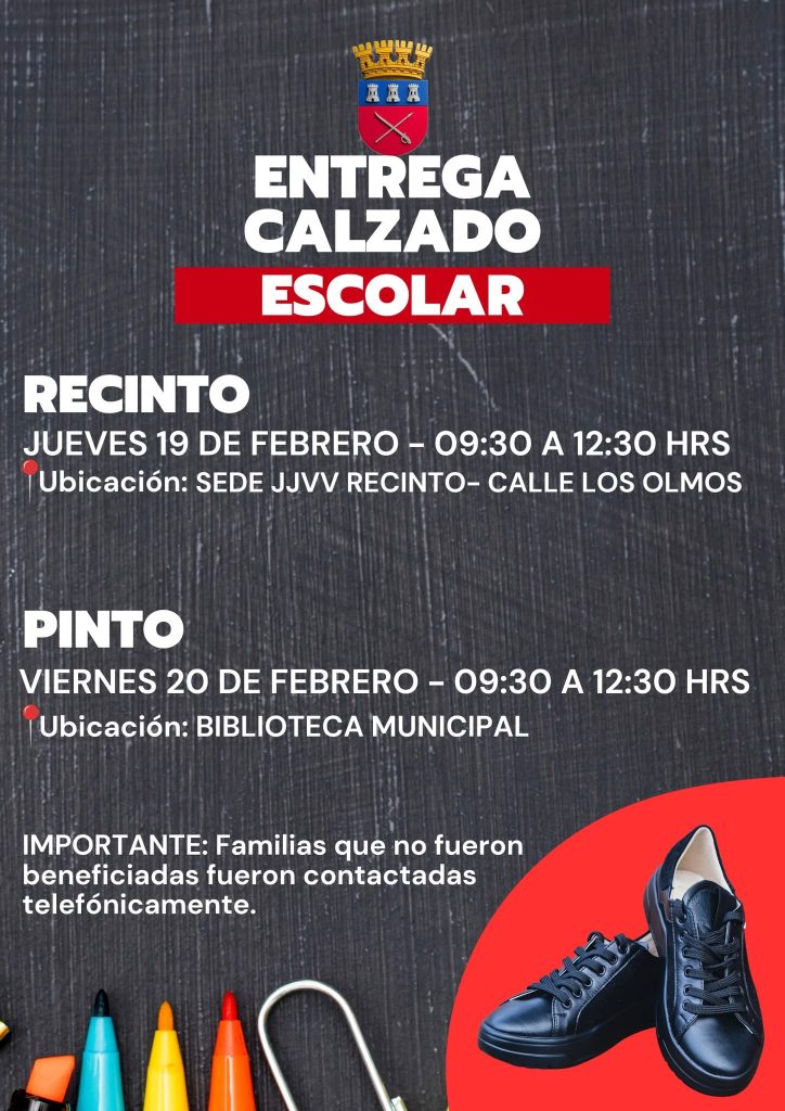 La Municipalidad informó que se realizará la distribución de calzado escolar en dos jornadas. El jueves 19 de febrero, la entrega será en la sede JJVV de Recinto, de 09:30 a 12:30 horas.