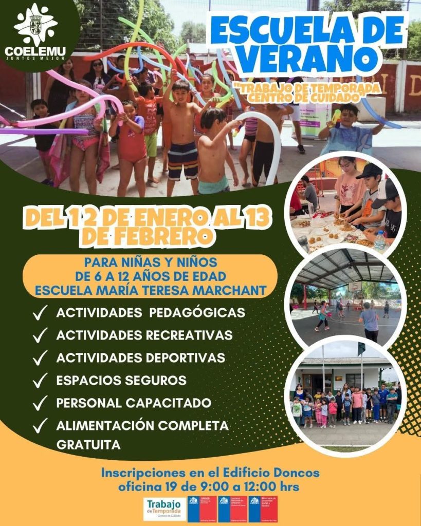 La Municipalidad de Coelemu invita a participar en la Escuela de Verano “Trabajo de Temporada Centro de Cuidado”, que se desarrollará entre el 12 de enero y el 13 de febrero en la Escuela María Teresa Marchant. El programa está dirigido a niñas y niños de 6 a 12 años, ofreciendo actividades recreativas, pedagógicas y deportivas, además de espacios seguros con personal capacitado y alimentación completa gratuita.