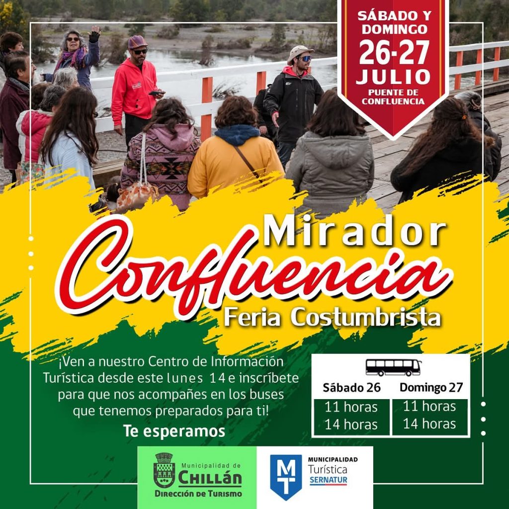 La Municipalidad de Chillán, a través de su Dirección de Turismo, invita a la comunidad a participar en la Feria Costumbrista «Confluencia», que se llevará a cabo los días sábado 26 y domingo 27 de julio en el reconocido Mirador Confluencia, ubicado en el Puente de Confluencia.