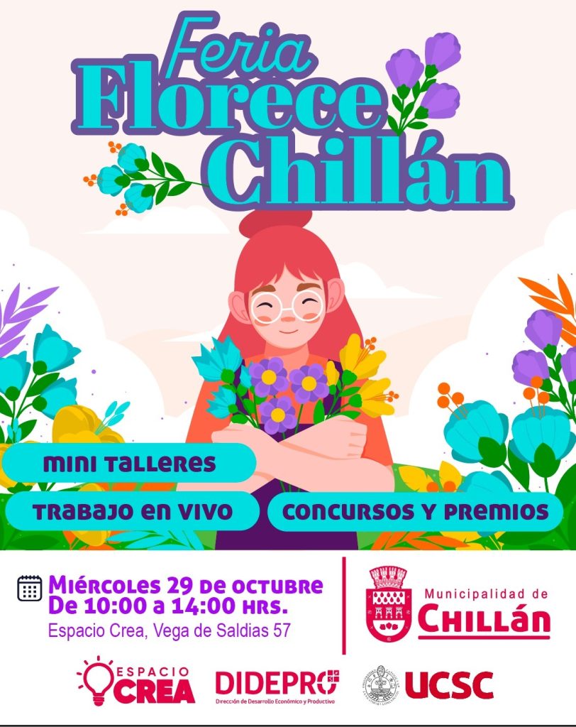 Este miércoles 29 de octubre, de 10:00 a 14:00 hrs, se realizará la Feria Florece Chillán en el Espacio Crea – Cowork Municipal (Vega de Saldías 57). El evento contará con 13 emprendedores que ofrecerán productos como plantas, decoración, velas, alimentos y servicios de bienestar. Además, se impartirán talleres gratuitos de suculentas y cemento blanco, junto con premios y regalos. La entrada es liberada.