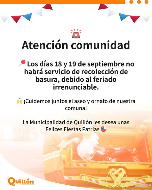 Les recordamos que los días 18 y 19 de septiembre no habrá servicio de recolección de basura, debido al feriado irrenunciable.