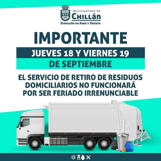 InicioNOTICIAS ÑUBLEFeriado irrenunciable: no habrá recolección de basura en Chillán Feriado irrenunciable: no habrá recolección de basura en Chillán Deja un comentario / NOTICIAS ÑUBLE Compartir Información importante Municipalidad de Chillán informa a la comunidad que este 18 y 19 de septiembre el servicio de retiro de residuos domiciliarios no funcionará debido a que es feriado irrenunciable. Fuente: Municipalidad de Chillán Visitas: 5
