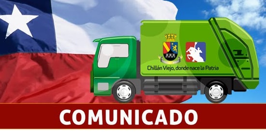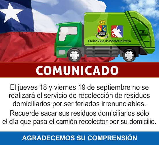 Que este jueves 18 y viernes 19 de septiembre no habrá servicio de retiro de residuos domiciliarios, ya que se conmemoran las fiestas Patrias y las Glorias del Ejército, feriados irrenunciables.
