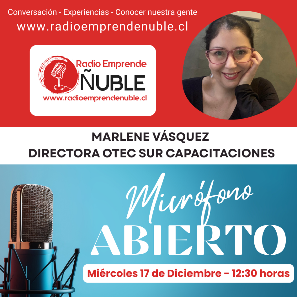 Este miércoles 17 de diciembre a las 12:30 horas, acompáñanos en Micrófono Abierto por Radio Emprende Ñuble. Conversamos con Marlene Vásquez, directora de OTEC Sur Capacitaciones, sobre formación, oportunidades y el impulso al talento local. 💬 Experiencias reales, historias que inspiran y el compromiso de quienes hacen crecer nuestra región.