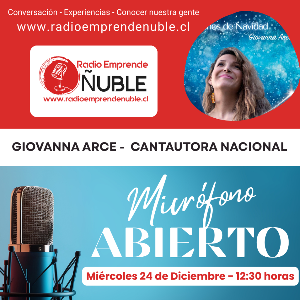 Este miércoles 24 de diciembre a las 12:30 horas, acompáñanos en Micrófono Abierto por Radio Emprende Ñuble. La cantautora nacional Giovanna Arce nos regala una jornada especial con música navideña, historias y conversación cercana. Vive la magia de la Navidad junto a una voz que inspira.
