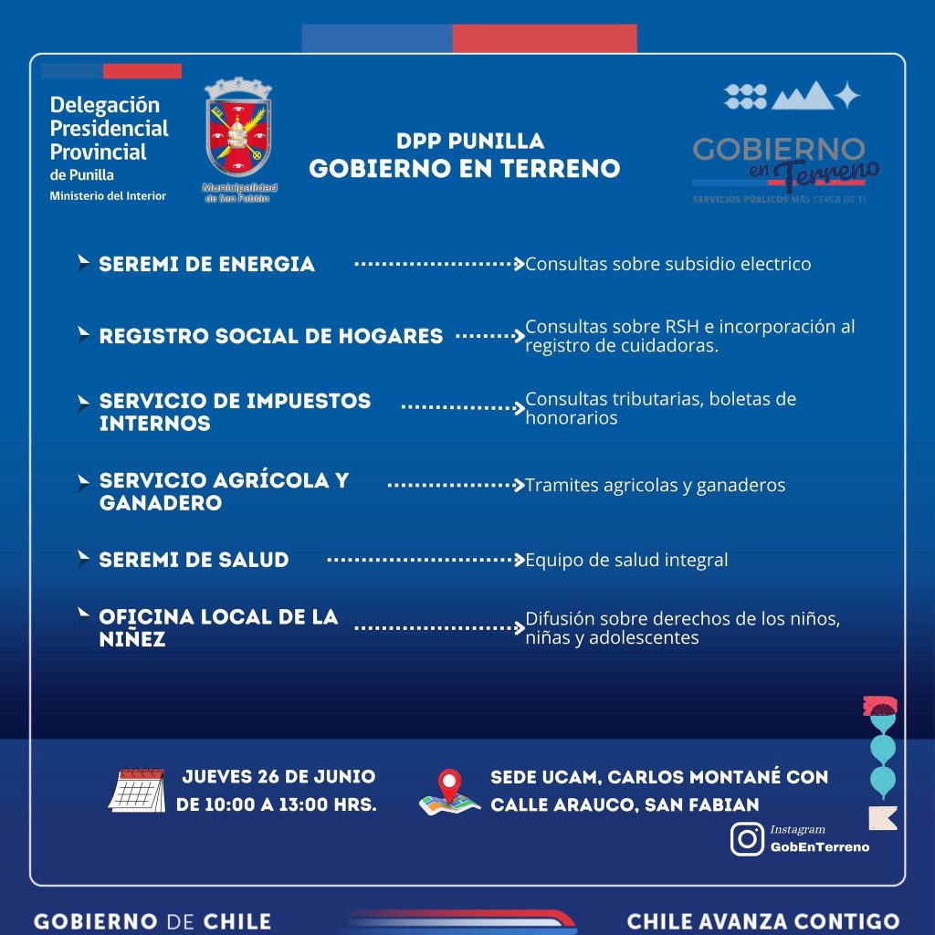 🔹Con el propósito de descentralizar los servicios públicos y acercarlos a nuestra comunidad, este jueves 26 de junio realizaremos un Gobierno en Terreno en la comuna de #SanFabián.