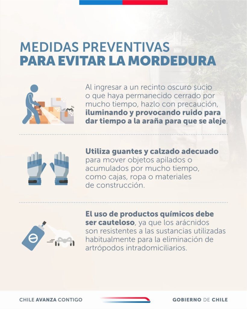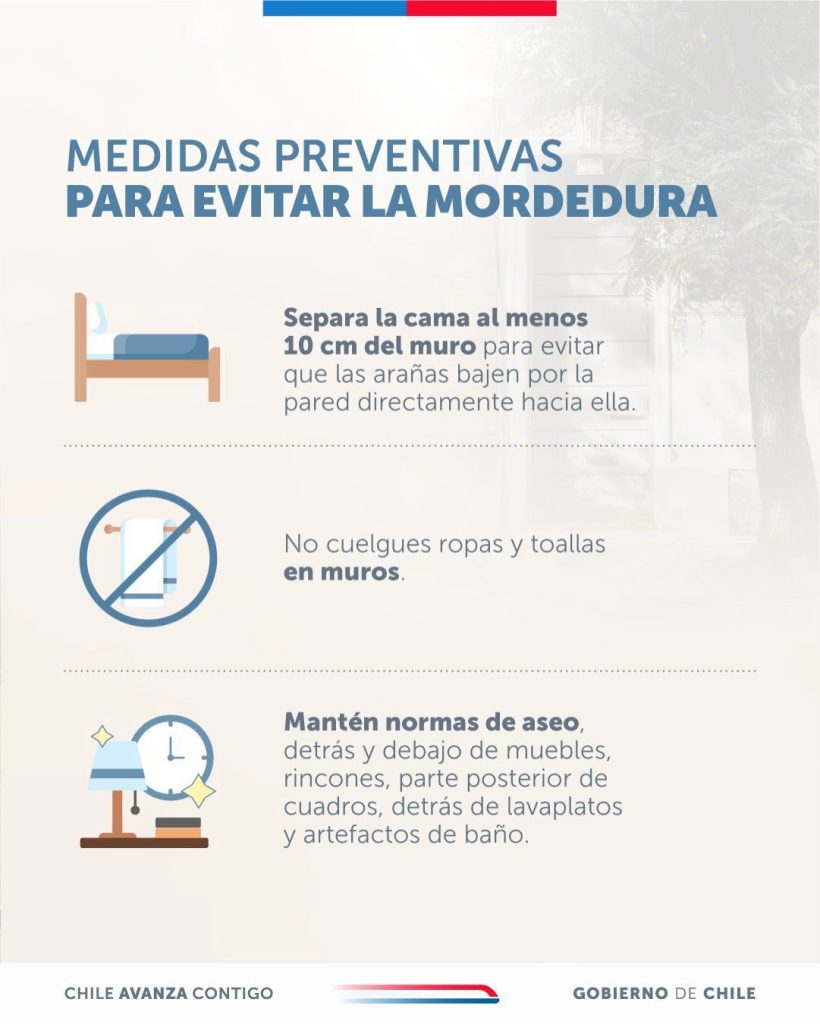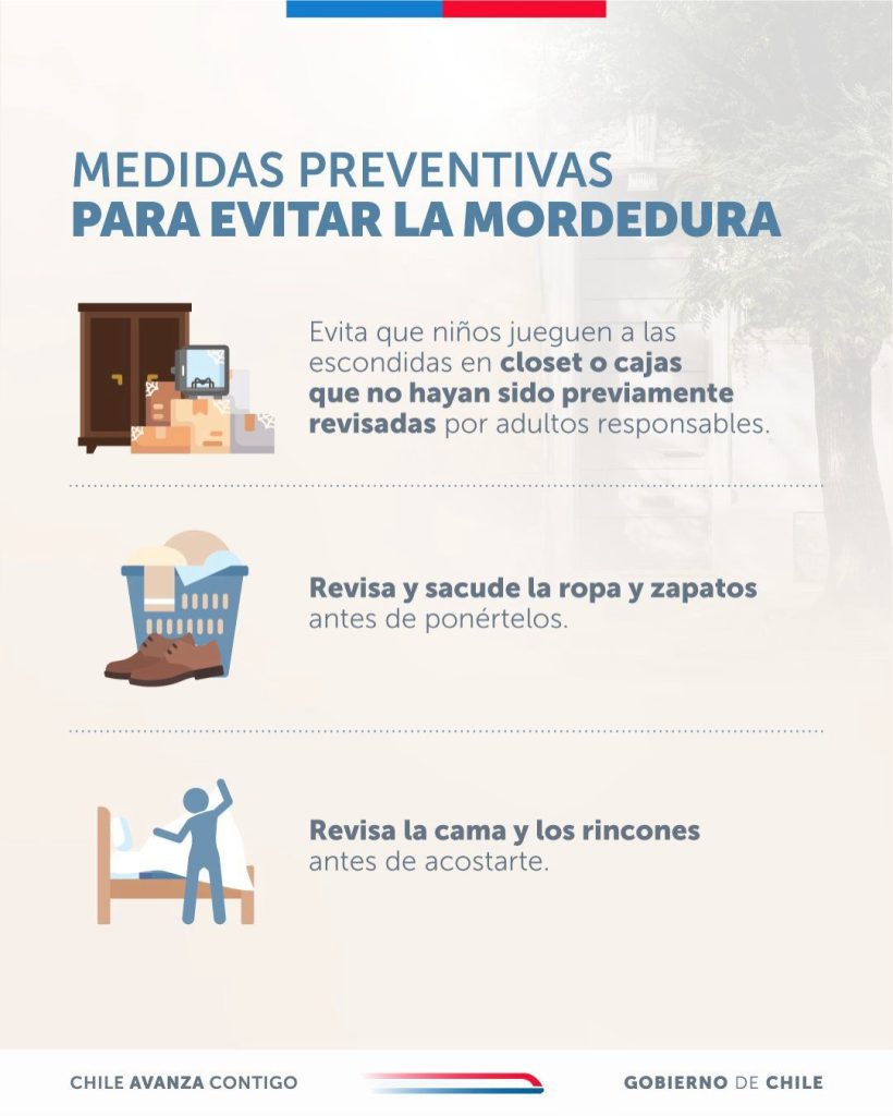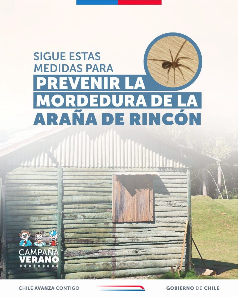 El Gobierno de Chile lanzó una serie de recomendaciones visuales para prevenir mordeduras de la araña de rincón durante el verano. Las medidas incluyen revisar ropa, camas y rincones antes de usarlos, mantener la limpieza en zonas oscuras y evitar que niños jueguen en espacios cerrados sin supervisión.