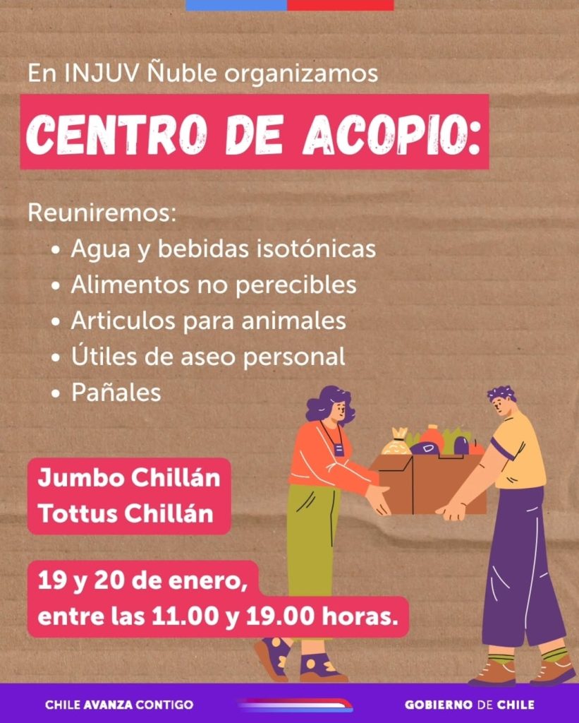 El Instituto Nacional de la Juventud (INJUV) Ñuble organiza un centro de acopio los días 19 y 20 de enero en los supermercados Jumbo y Tottus de Chillán, entre las 11:00 y 19:00 horas.