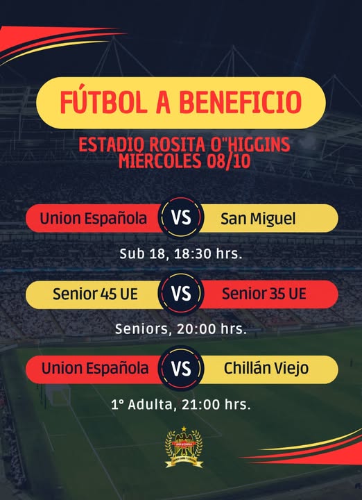 Este miércoles 8 de octubre, el Estadio Rosita O’Higgins será escenario de una emotiva jornada deportiva con sentido solidario. Bajo el lema “Fútbol a Beneficio”, se realizarán tres encuentros amistosos en apoyo directo a los jugadores Tomás Espinosa y Pablo Sáez, ambos pertenecientes a la serie sub-18 de Unión Española y actualmente en proceso de recuperación por lesión.