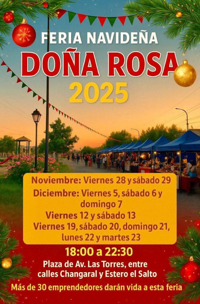 Con espíritu festivo y más de 30 emprendedores locales, la Feria Navideña Doña Rosa 2025 se instala en la Plaza de Av. Las Torres, entre Changaral y Estero el Salto. El evento se desarrollará durante varios fines de semana entre noviembre y diciembre, ofreciendo artesanías, regalos, gastronomía y música en un ambiente familiar. La feria abre sus puertas de 18:00 a 22:30, invitando a la comunidad a celebrar y apoyar el comercio local en vísperas de Navidad.